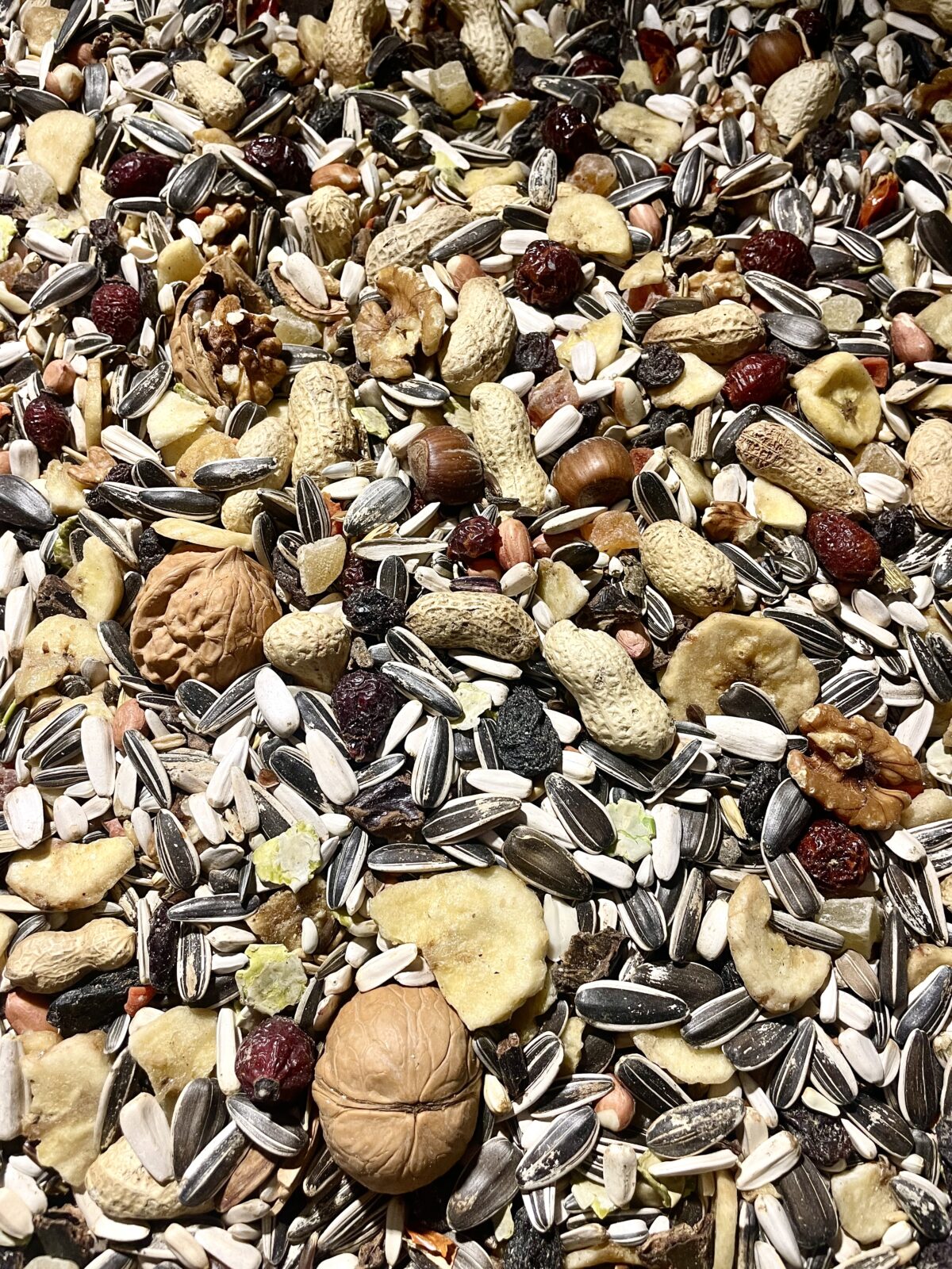 Složení: slunečnice bílá malá, slunečnice bílá velká, slunečnice žíhaná malá, slunečnice žíhaná velká, čirok bílý, čirok červený, oves celý, oves nahý, kardi, pohanka, paddy rýže, buráky ve slupce, buráky loupané, chili papričky, banány chips, hrachové vločky, svatojánský chléb, ovocné granule, mrkev, rozinky, papája, ananas, šípky, jeřabiny.